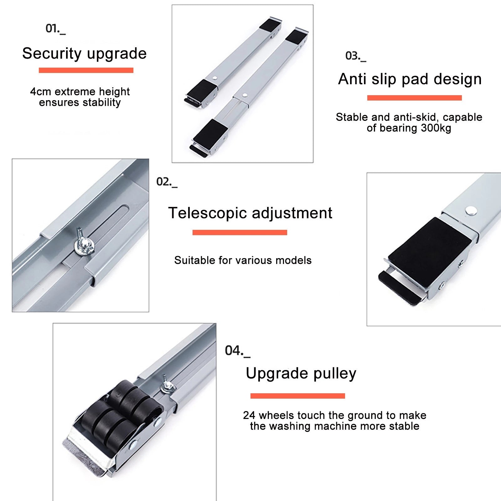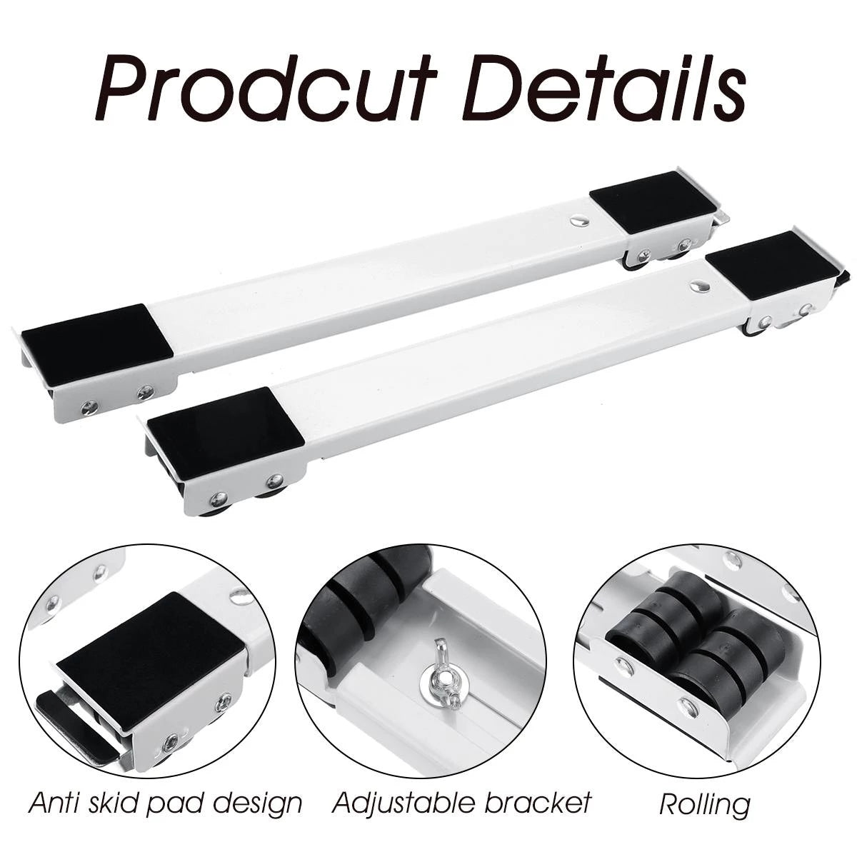 No complicated installation steps are required or tools. Simply place 2 brackets under the corners of refrigerators, washing machines, dishwashers, dryers, or other household appliances and furniture, Then gently step on the brake to fix the bracket.