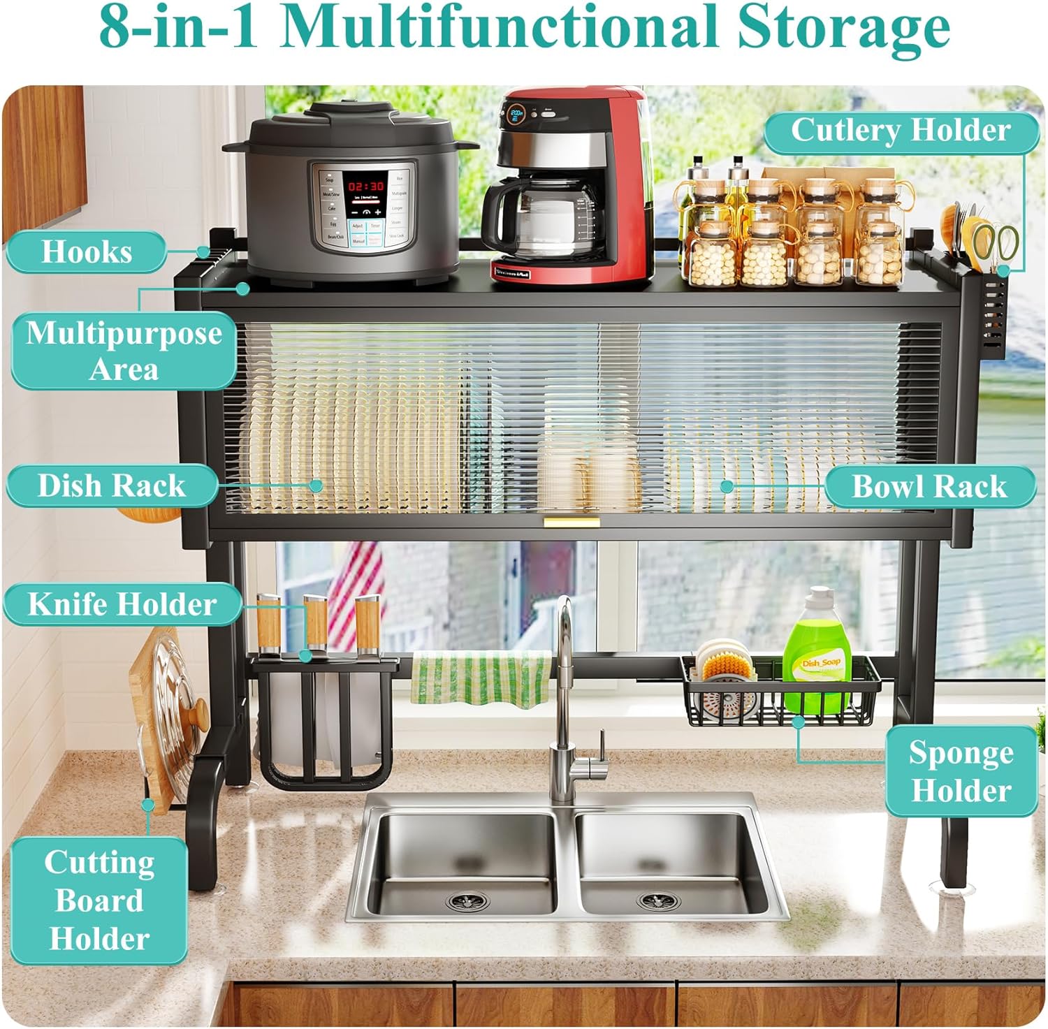 • Large Capacity - Featuring an all-in-one design, our over sink dish drying rack offers more upper storage space to you. The main rack can store 9 plates, 16 bowls, 1 pressure cooker, 1 toaster, and 8 cups, and the accessories can also store many other items, such as sponges, knives, cups, cutting boards, and utensils. It greatly meets the needs of your kitchen storage and could be a better choice for you.