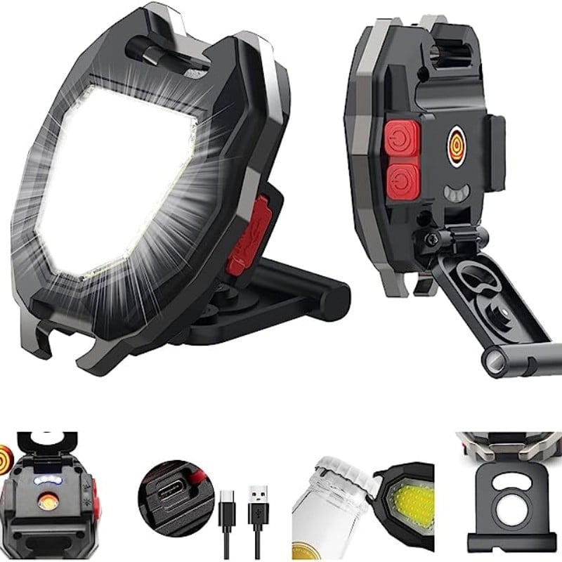 Five-in-One:The COB Keychain Light is a powerful tool that combines a survival whistle, tungsten wire igniter, lighting source, bottle opener, and foldable stand in one compact and lightweight package.